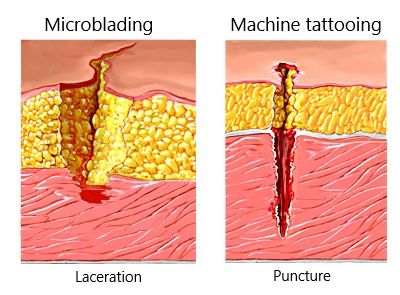 This image should help to demonstrate the difference between the wounds left by microblading and tattooing respectively. The puncture wound is smaller with cleaner edges, making it much quicker and easier to heal. Microblading leaves a laceration that is larger, more traumatic, which can exacerbate the healing process.