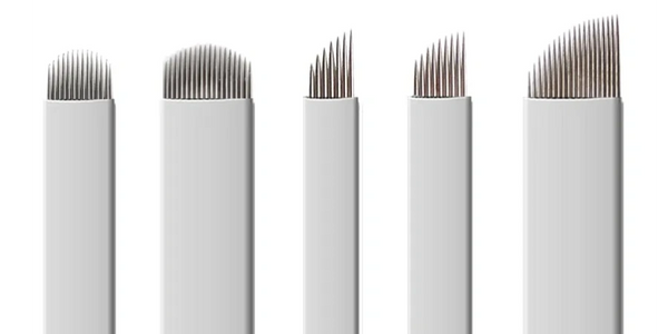These are various styles of microblade. This tool is used like a knife in a cutting motion to create lacerations in the skin, which are then rubbed with ink to create hairstroke eyebrows.